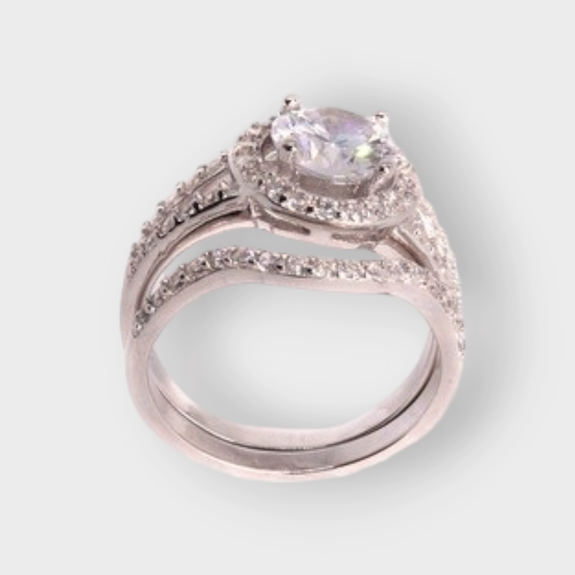 2 Piece Round Stone Studded Cubic Zirconia With Sterling Silver Ladies Wedding Ring & Band